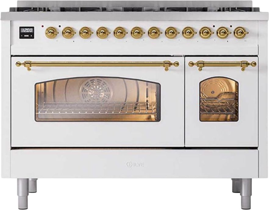 Introducing the new Nostalgie II 48" dual fuel range, a classic addition with a touch of innovation to any kitchen. This range feature sealed burners equipped with total black brass burner that has a non-stick nanotechnological coating, heavy cast iron grates, 3.5 + 1.52 cu. ft. total double oven capacity and soft closing door system.Read More